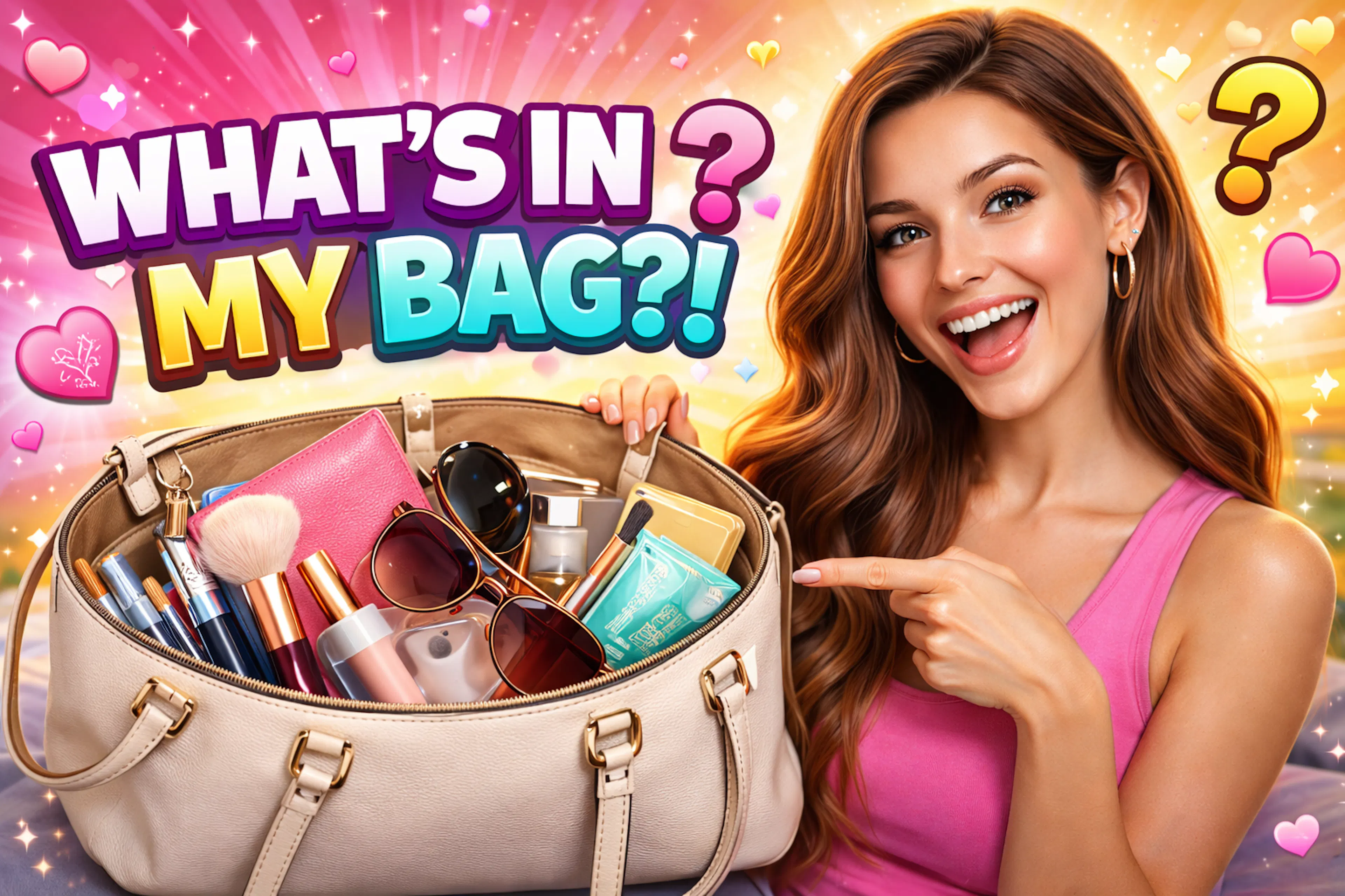 A vibrant “What’s in My Bag” thumbnail for a Gen-Z influencer.