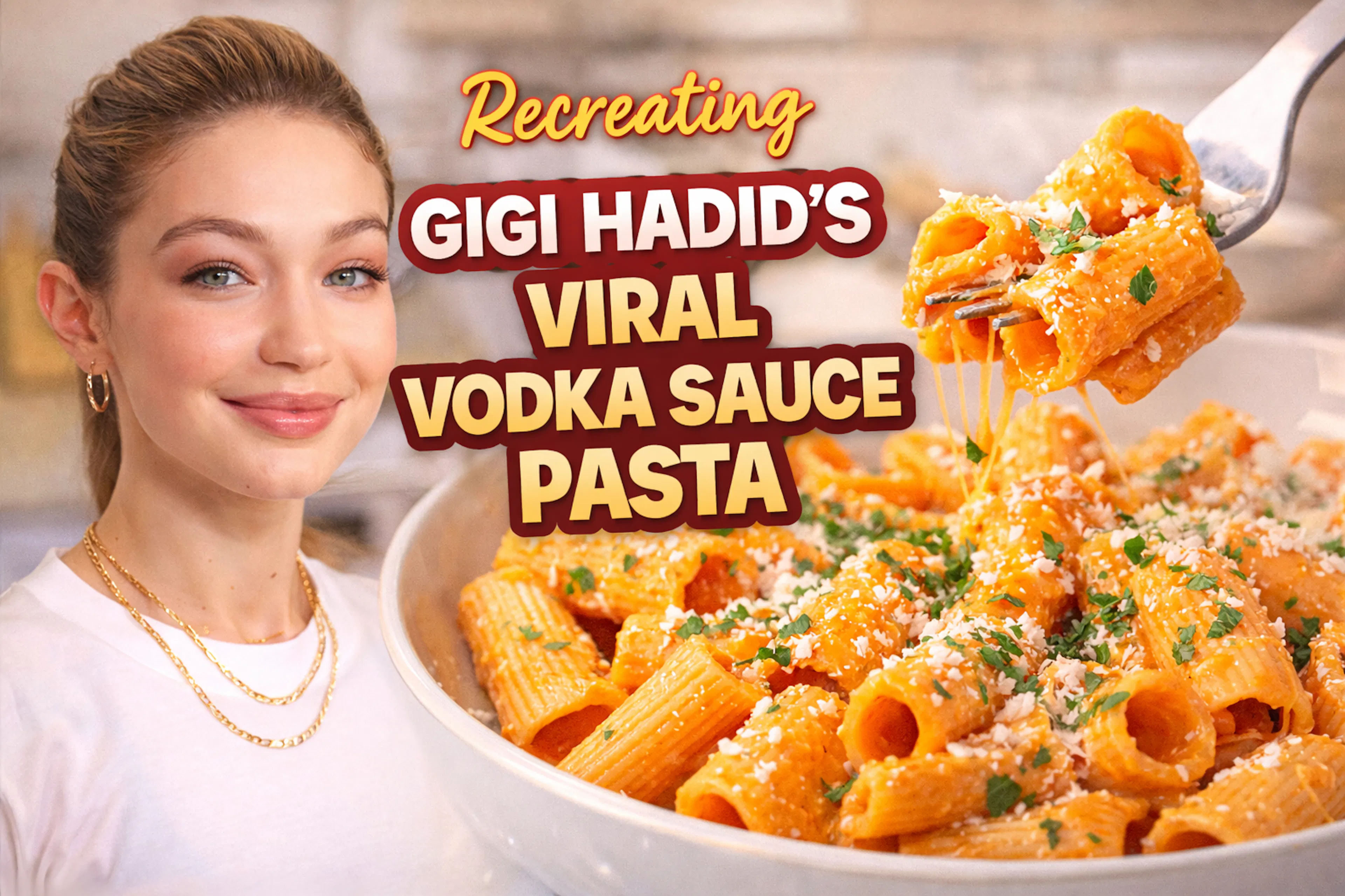 A food influencer recreating Gigi Hadid’s viral vodka sauce pasta.
