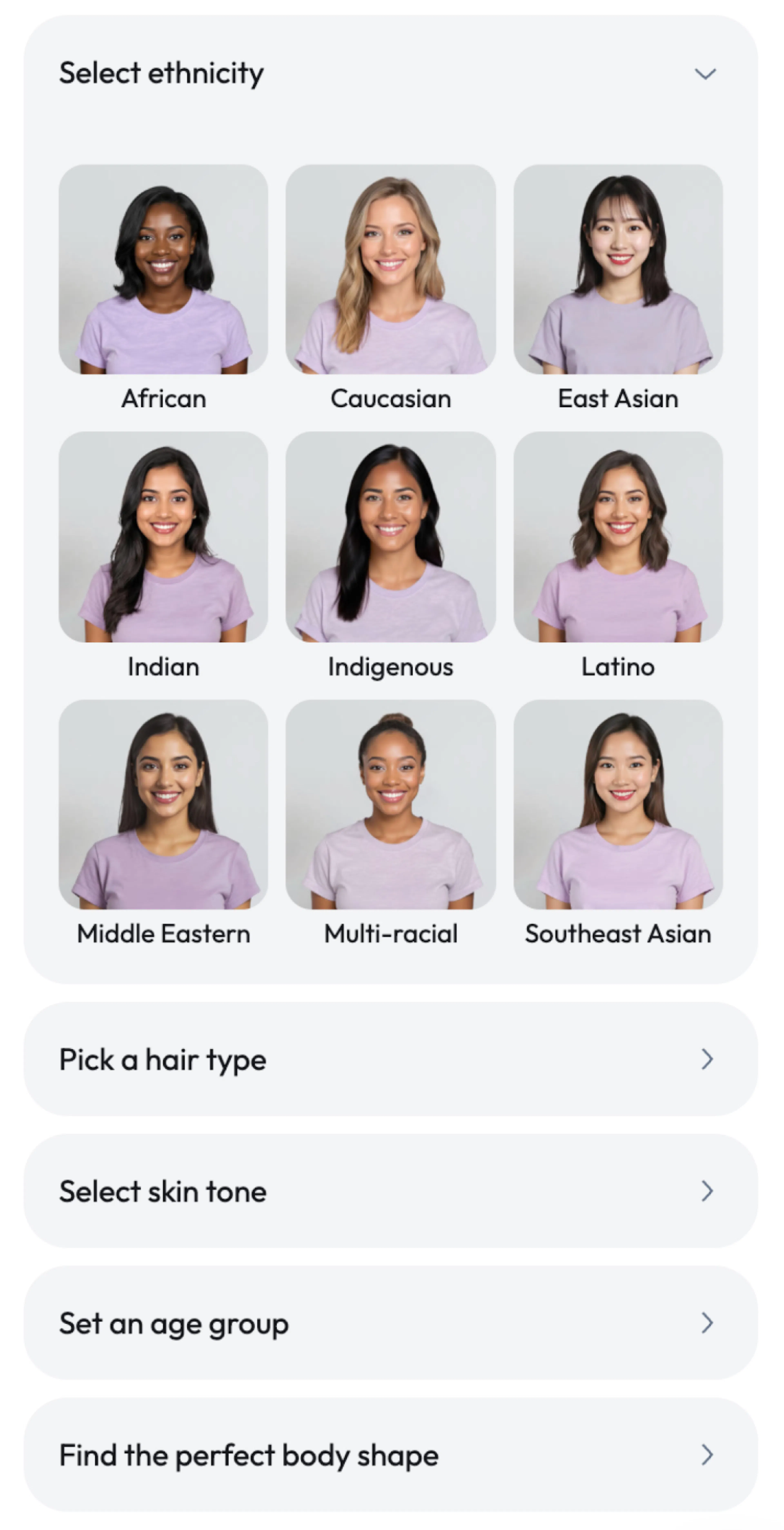 After this, you have various options to create your own model. From choosing ethnicity to picking a hair type, skin tone, age group, and even the perfect body shape.