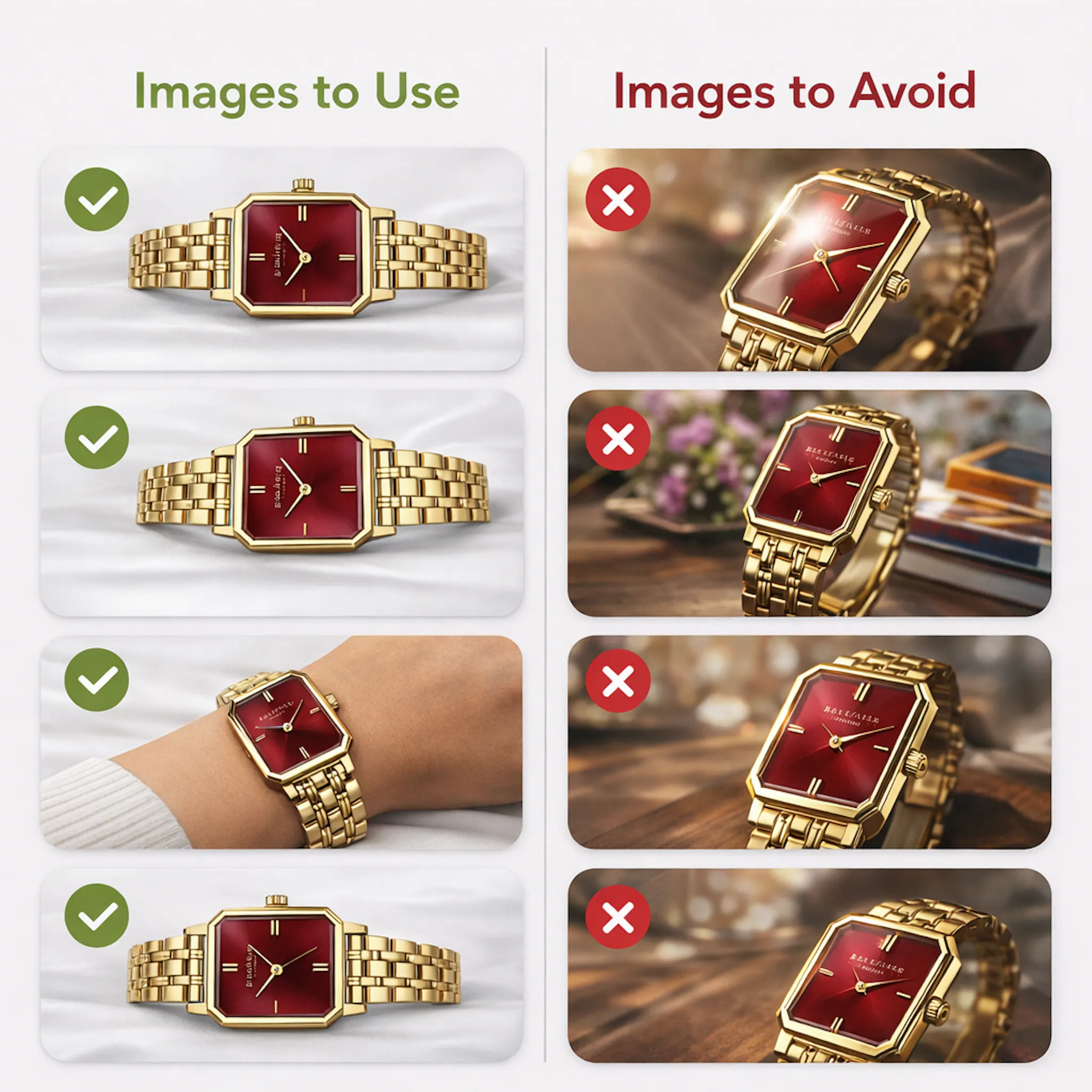 Not every watch image works well for AI styling or on-model placement. If you use the wrong kind of source image, then it can lead to unrealistic results, distorted proportions, or extra manual fixes. This will only consume your time and you will be stuck editing pictures all day long. Knowing what to avoid upfront saves time and helps you get cleaner, more accurate outputs.