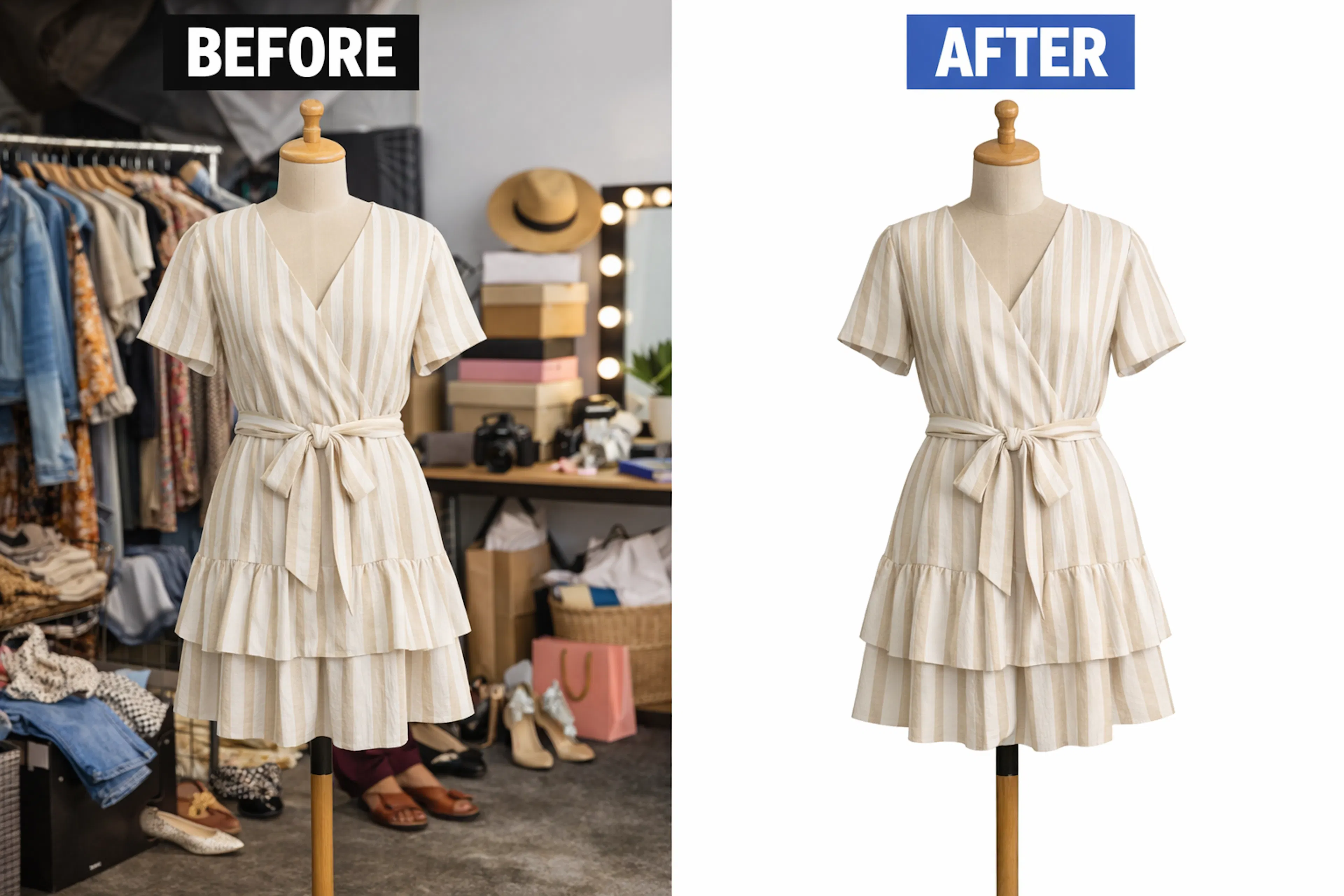 I chose this background because it supports the product instead of competing with it. It enhances the look of the dress. Always remember that the right background reduces distractions, highlights key details, and helps shoppers quickly understand the product’s style, quality, and intended use.