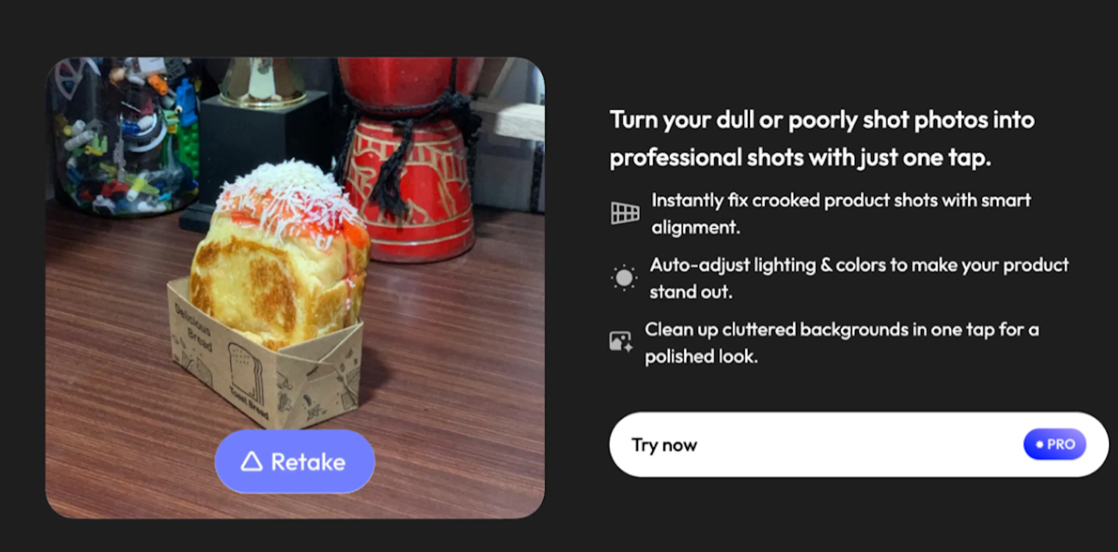 You don’t have to over-edit the pictures. All you need to do is make the products look cleaner, clearer, and more professional. Go to the “Studio Shot” feature and click the “Fix this Photo” option. As seen on the image below, you can align the crooked product shots, adjust the lighting, and clean your cluttered backgrounds.