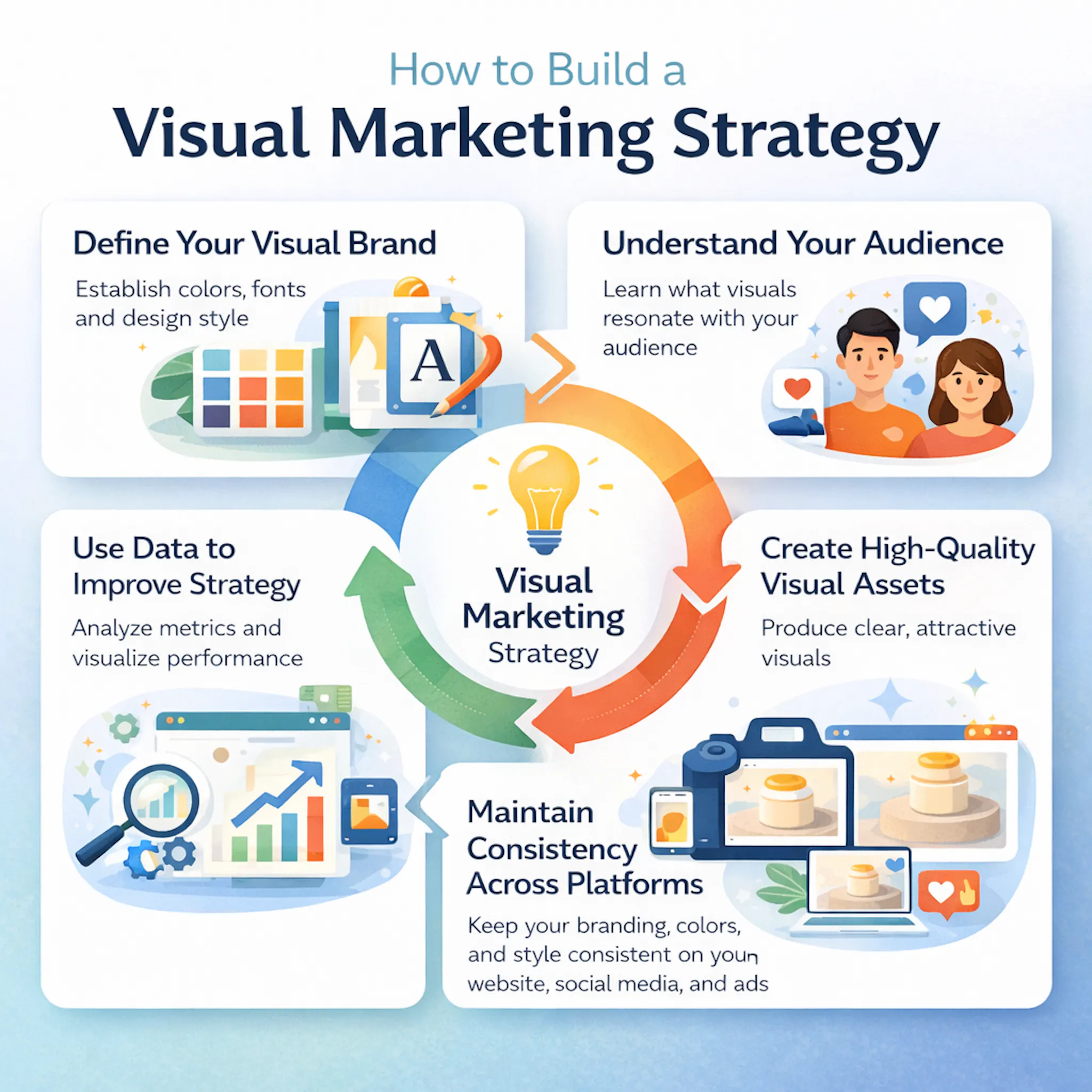 Creating effective visuals occasionally is helpful, but real results come from a well-planned visual marketing strategy. Small businesses can build a strong strategy by following a few key steps.