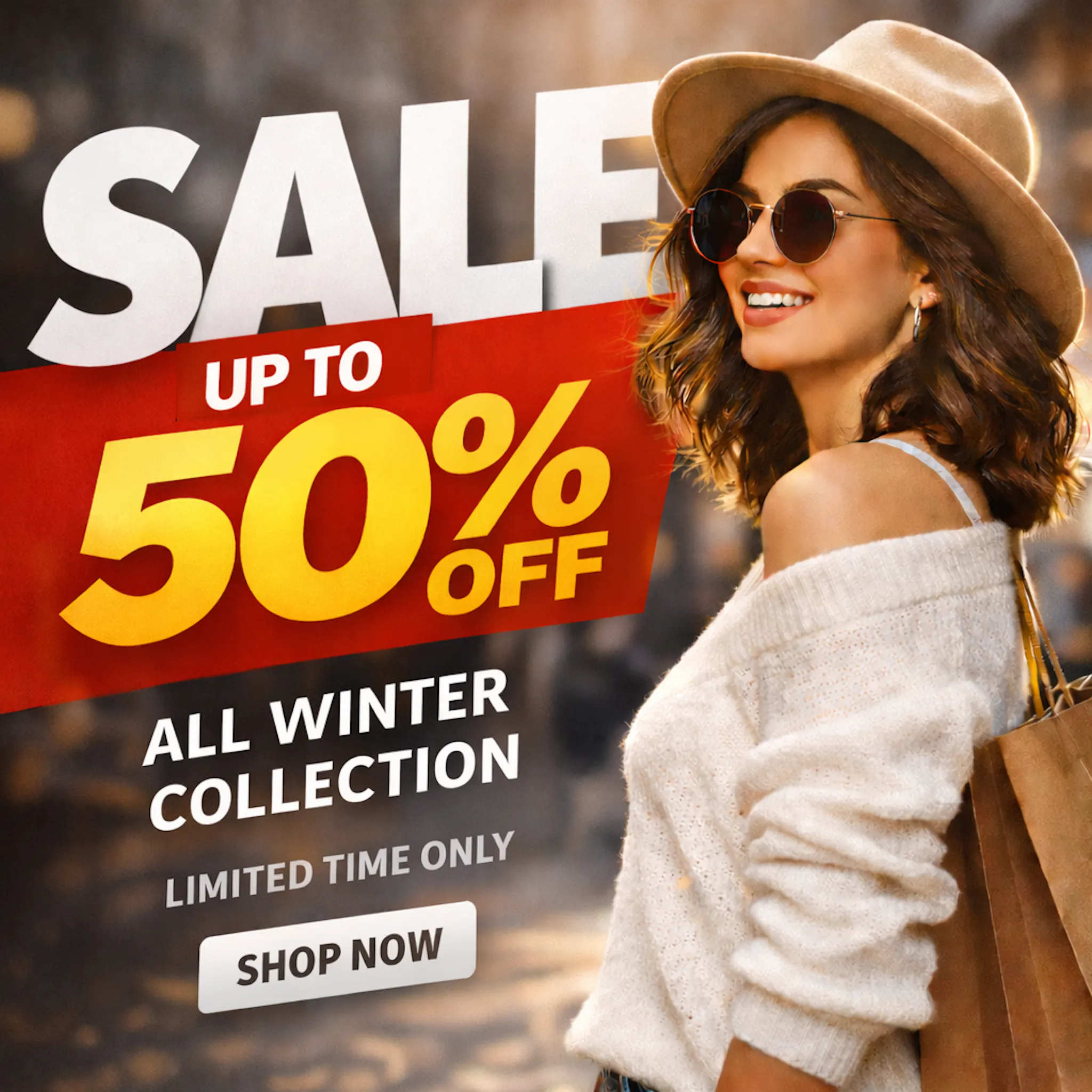 If you want your sale poster templates to look modern and premium, this is a must. The “text behind image” by Blend adds layering by placing text partially behind your subject.