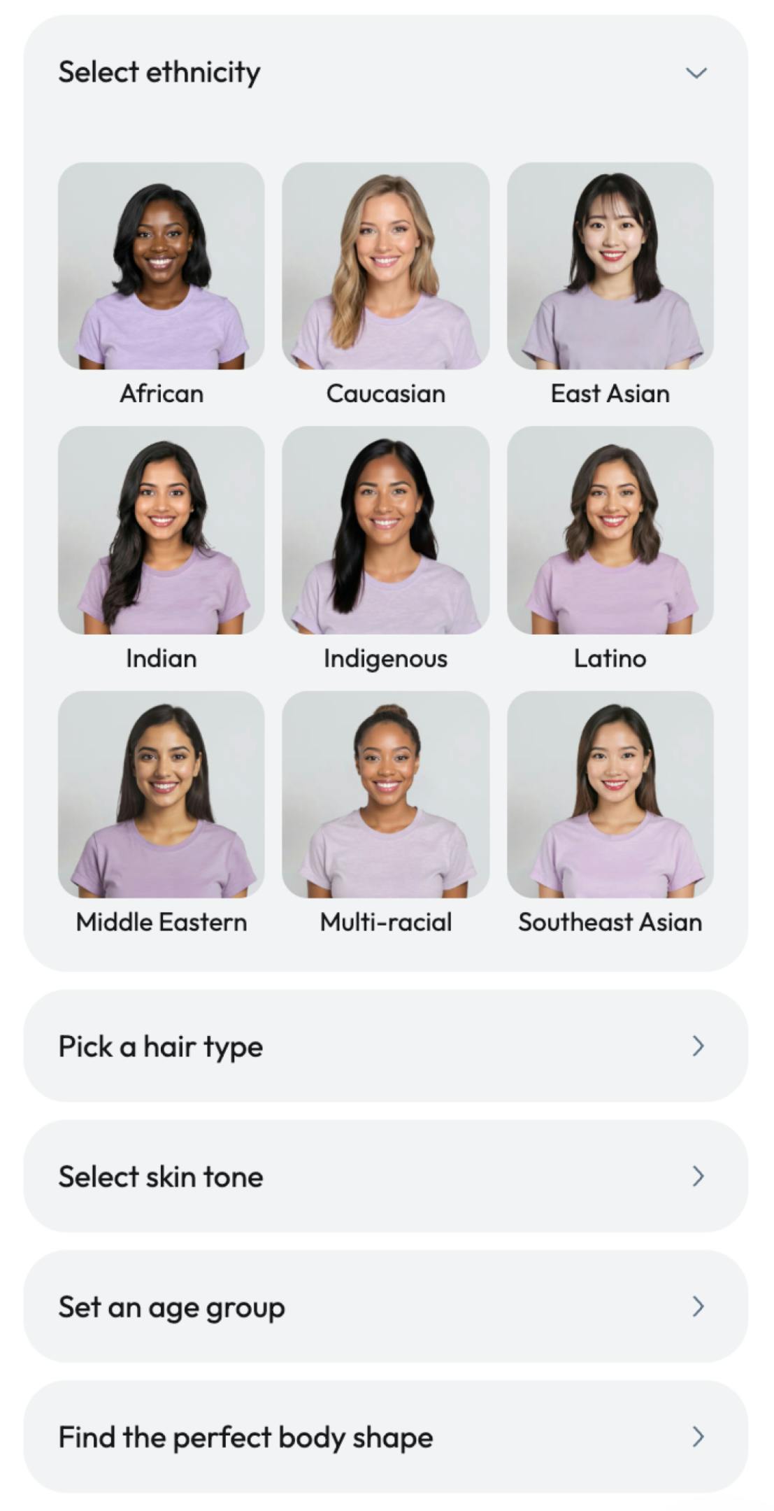 After this, you have various options to create your own model. From choosing ethnicity to picking a hair type, skin tone, age group, and even the perfect body shape.