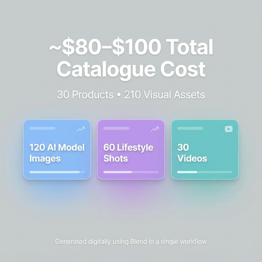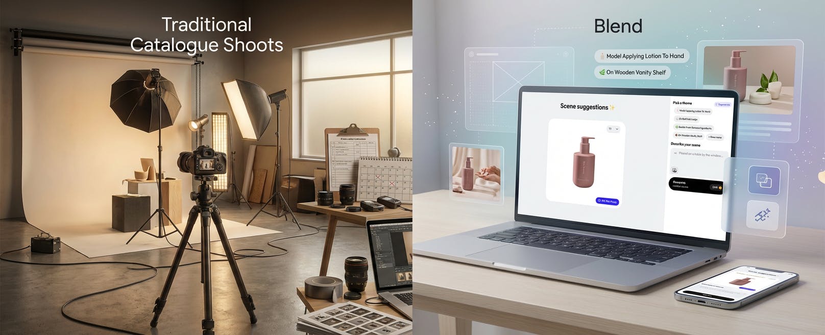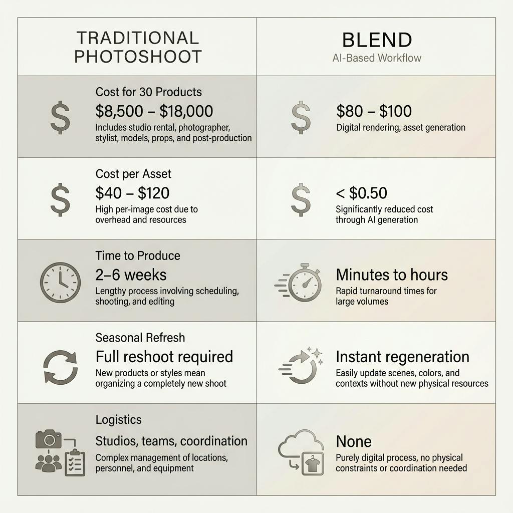 Traditional catalogue photography scales through people, logistics, and repeated spending. Blend scales through software.