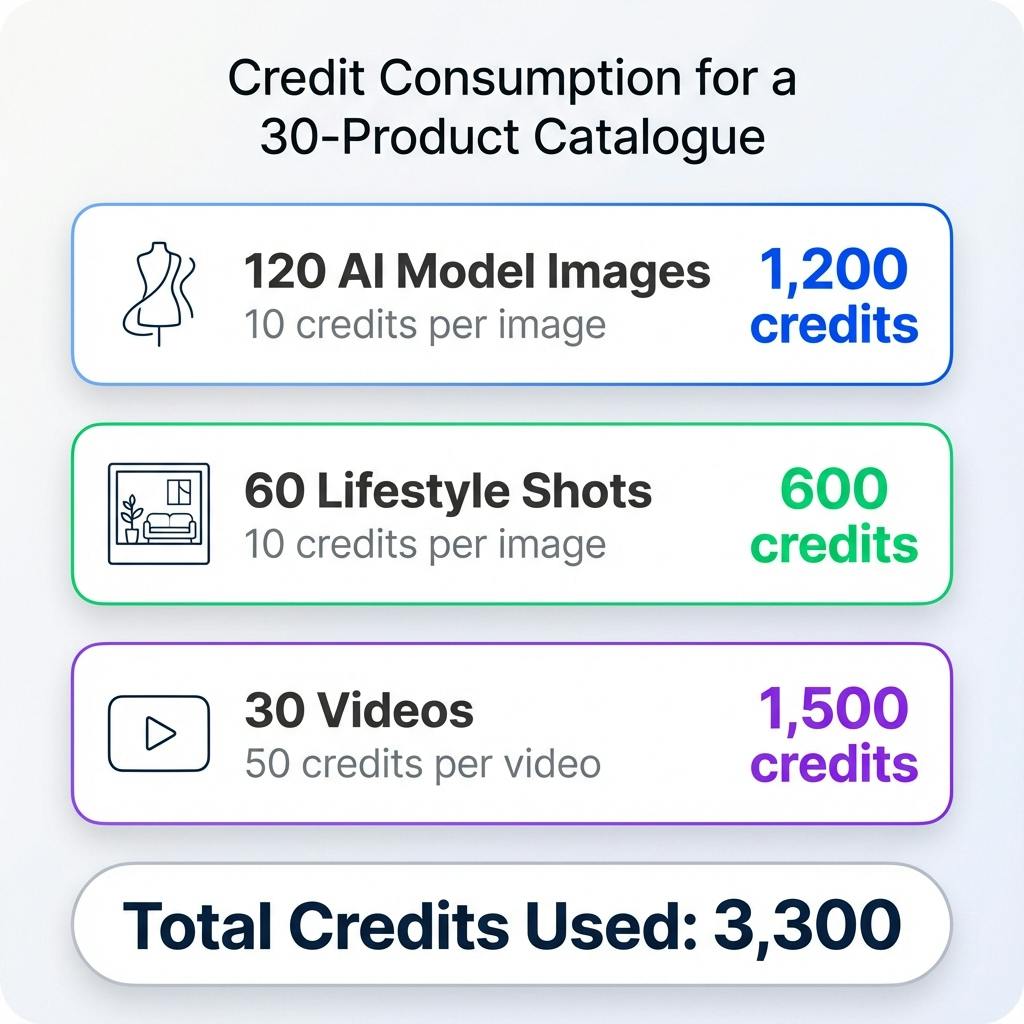 Now look at the graphic to see how many credits are consumed to get these assets, which include AI model images, lifestyle shorts, and videos. The total credit consumed at the end for 30 products across the entire catalogue is around 3300.