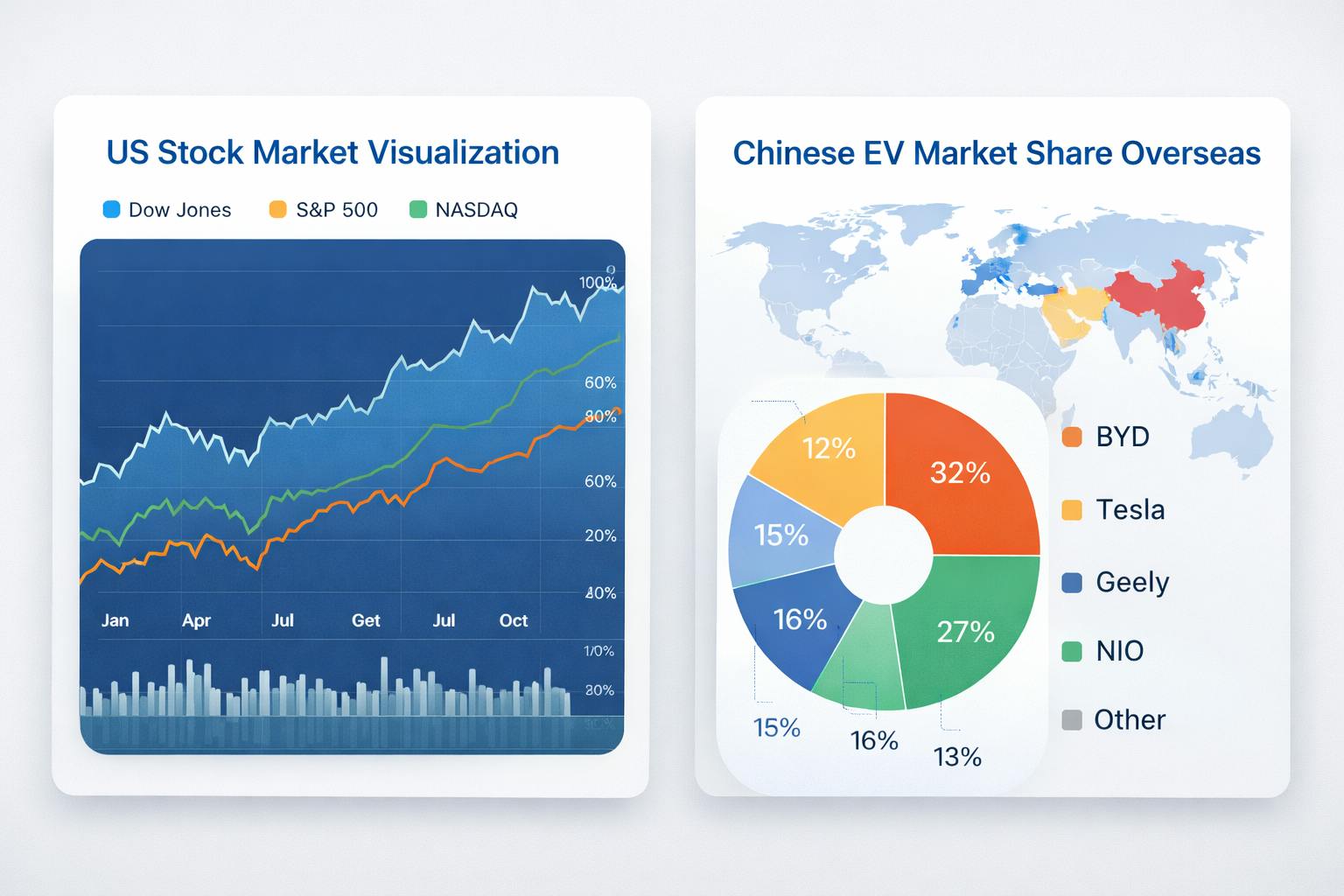 For example, financial analysts frequently use charts for US stock market visualization to illustrate trends and market movements. Similarly, industry analysts may create reports that include graphics for stock market visualization or charts explaining trends such as visualizing Chinese EV market share overseas.